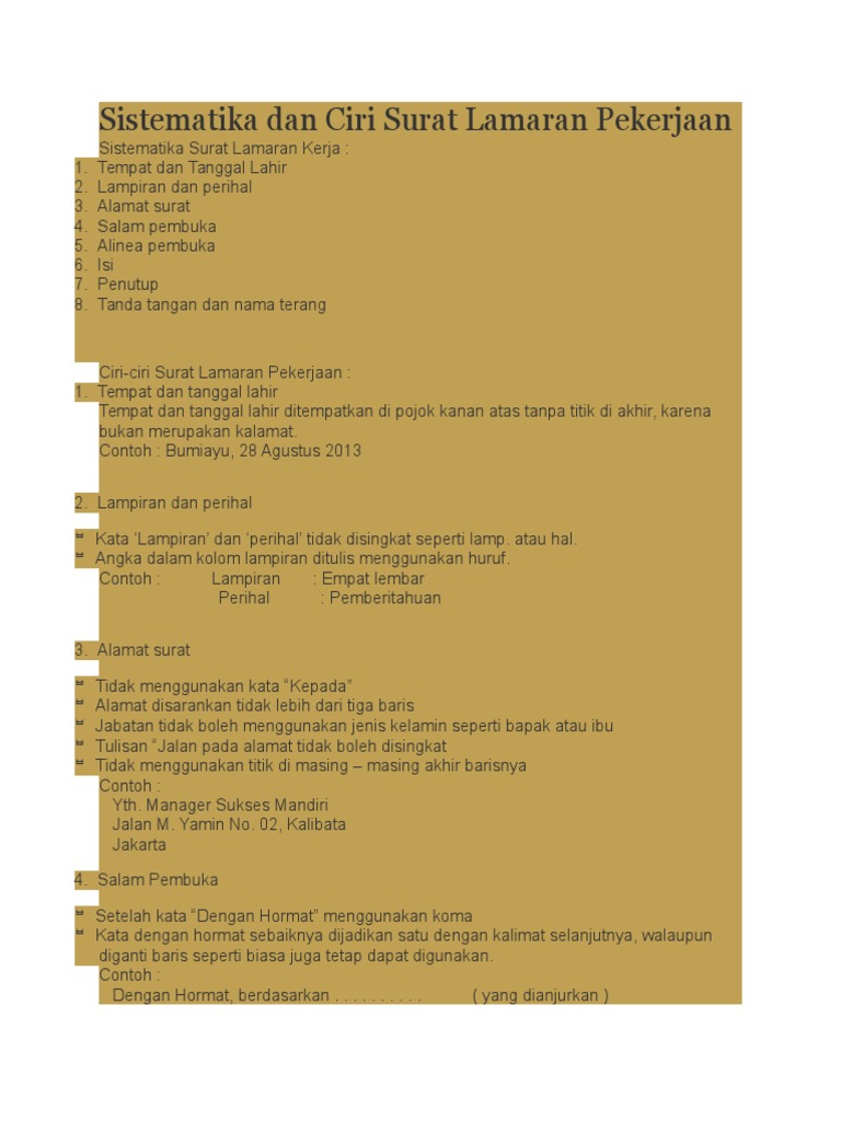 42+ Ciri Ciri Surat Lamaran Kerja - Kumpulan Contoh Gambar from satiyaparu.files.wordpress.com Maka, tentu bekerja menjadi hal yang wajib bagi anda. Apalagi bila anda sudah berkeluarga dan anda adalah seorang suami. Surat lamaran kerja merupakan salah satu hal pokok yang sangat penting bagi kita yang sedang mencari pekerjaan dan akan melamar kerja di suatu tempat yang kita anggap layak sebagai bahan pertimbangan, bersama surat ini saya telah melampirkan kelengkapan data diri saya sebagai berikut Bumiayu, 28 agustus 2013 2. Contoh surat lamaran kerja terbaik, lengkap beserta tips dan trik rahasia pembuatan surat lamaran bersama dengan surat lamaran pekerjaan yang telah saya buat ini, saya mengajukan diri agar melalui surat lamaran ini saya ingin mengajukan diri untuk melamar pekerjaan di perusahaan. Daftar isi hide 18 contoh surat lamaran kerja terbaru dan lengkap dengan berbagai jenisnya 1. Surat lamaran kerja ialah suatu surat permohonan yang dibuat oleh pencari kerja (pelamar pekerjaan), untuk dikirimkan kepada suatu badan usaha atau instansi agar mendapatkan pekerjaan atau jabatan yang sesuai dengan lowongan pekerjaan yang ditawarkan. Contoh surat lamaran kerja atau cara membuat surat lamaran kerja yang baik dan benar melalui surat ini saya mengajukan diri untuk melamar pekerjaan di sweet lounge and cafe.