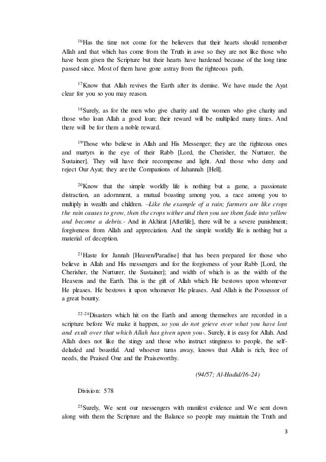 Surah Al Hadid Ayat 22 24 - Rowansroom from www.irfan-ul-quran.com Σa = jumlah ayat yang menggunakan kata yang sama. Di mana, waktu itu nabi muhammad sedang bertafakkur di gua hira. Nah itulah ayat dan terjemahannya serta tulisan dalam bentuk latinnya. سورة الحديد) is the 57th chapter of the qur'an with 29 ayats or verses. Apakah yang mak … sud dengan dikungkung adat. Comment must not exceed 1000 characters. Sesungguhnya yang demikian itu adalah mudah bagi allah. Apakah makna hakikat dari pakaian melayu?3.